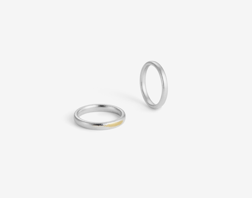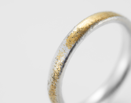 身につけているうちに表情が変わっていくウェディングリングです。シルバーで薄くコーティングを施したシンプルなかたちのゴールドリングは、時間の経過とともに、ゴールドの地肌が見えてきます。表情の変化を眺めるたび、二人が共有している時間を感じることができます。