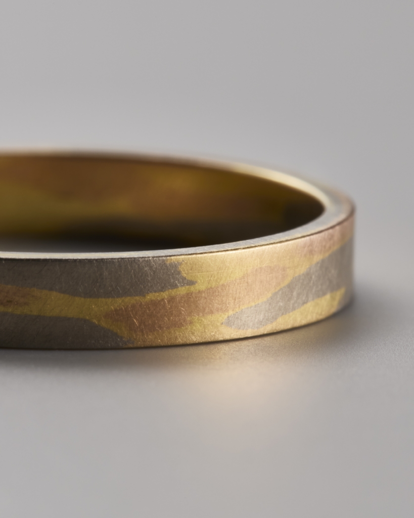 MARBLEのジュエリーは、石灰岩を貴金属に置き換える発想から、一つ一つ、手仕事によって地金に圧力を加えて制作されています。—— たとえばイエローゴールドとホワイトゴールドが混ざり合うことで生まれる抽象パターン。自然の大理石の模様と同様に、一つとして同じパターンはありません。制作過程ではジャクソン・ポロックのアクションペインティグのような力強い手跡も感じられますが、なめらかに研ぎ出された完成形は静謐な佇まいです。