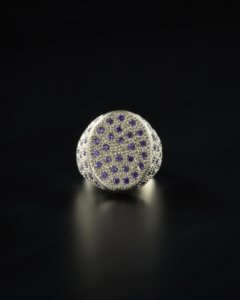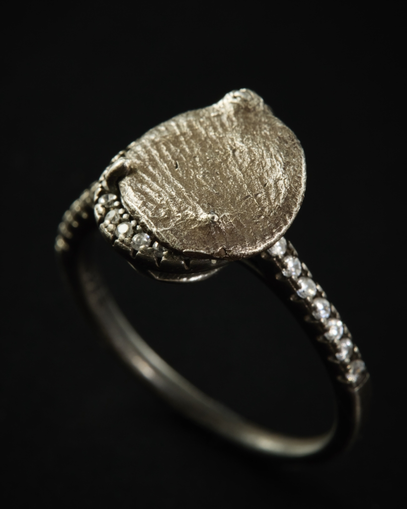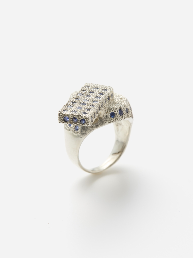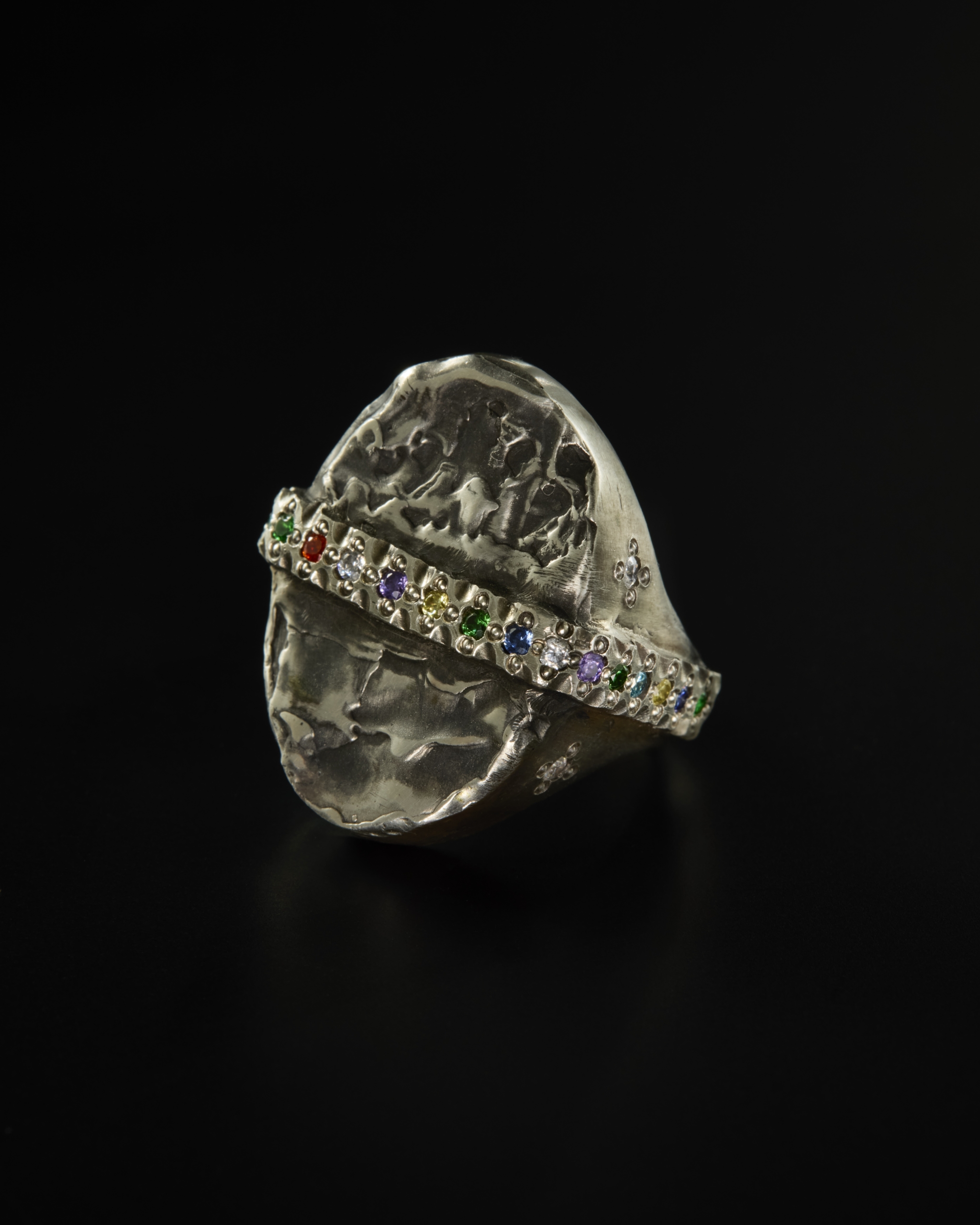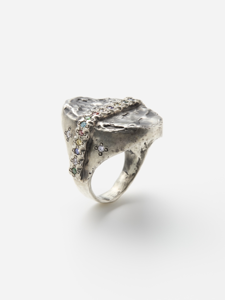 一方マックスは、造形的なフォルムにミル留めされた色石がカラフルにきらめくシルバーリングを中心に発表します。幼い頃に父のアトリエの傍らで遊んでいた時から、柔らかい蝋を手で成形する工程に創造の自由を感じて魅了されてきたマックスにとって、ロストワックス鋳造が主な技法となっています。さらに石留めによって作品に色彩や質感を加えられるようになり、現在の作風が完成しました。また、様々な分野のアーティスト達とのコラボレーションも積極的に行ない、そこから受ける刺激がミックスされ、独自の個性を確立しています。