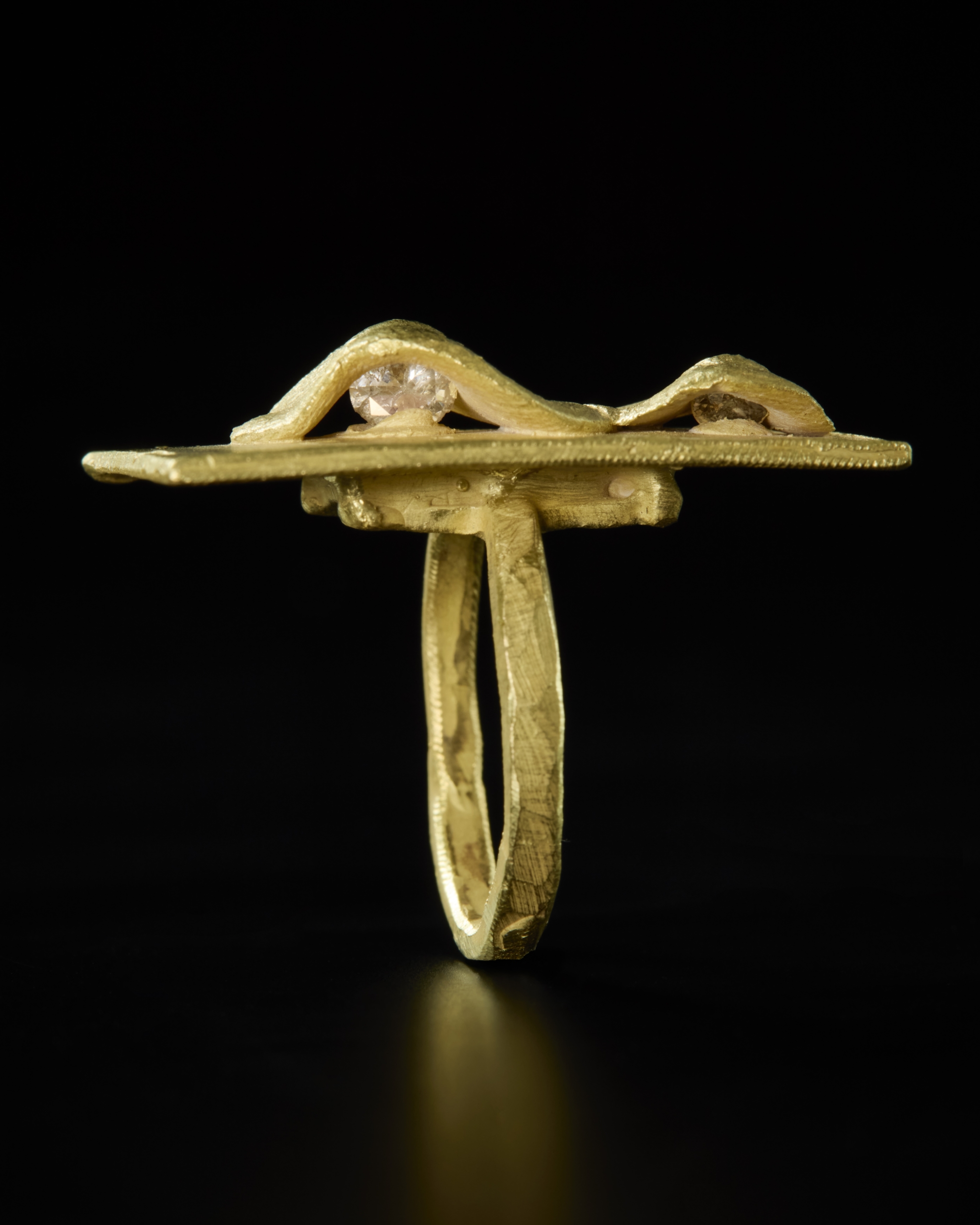 カールはこれまでの宝飾の常識を逸脱したユニークな制作手法によって、貴金属と宝石を大胆に合わせたリングを次々に発表しており、その情熱的な探究心はとどまることがありません。指輪にこだわることに概念的な理由はなく、ただ指輪と自分自身との間に強い絆を育んできただけと言うカール。「それぞれの指輪がピッタリの指を見つけられた時こそが幸せな瞬間」というシンプルかつ強い動機を持ち続け、日々作業机に向かっています。本展ではパールを用いたリングも複数お目見えします。