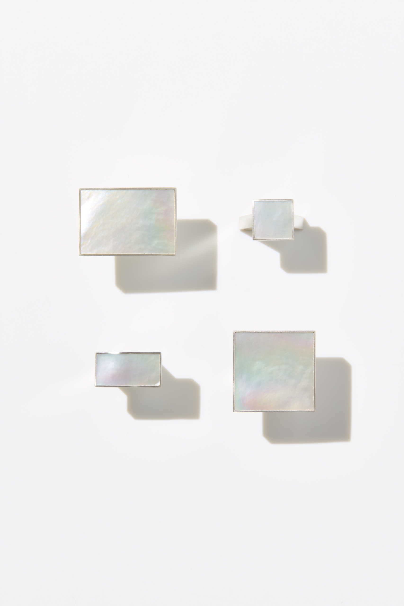一方、抽象的に光を捉えた四角形がモチーフの“Turrell”シリーズは、光と空間を題材とした作品を制作するジェームス・タレルからインスピレーションを受けて作られました。白蝶貝のなかでも感動を覚えるほど綺麗な部分だけを切り取って使用したというリングは、素材そのものの美しさを身に纏えるようなミニマムなデザインです。