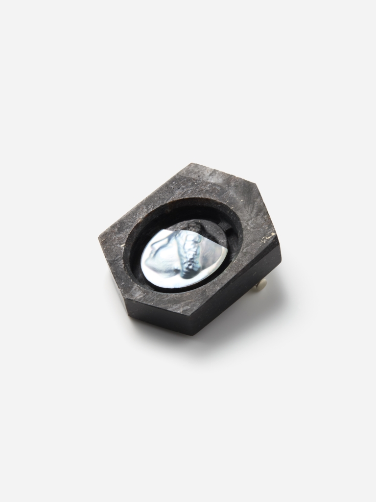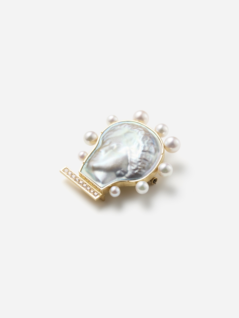 新作 ”PERMANENT_Cameo” シリーズでは独自の養殖技術と宝石切削技術を組み合わせ、ヌーマイトで作られたカメオの上にぴったりと真珠層が被っている、今までに見たことのないカメオジュエリーが出来上がりました。