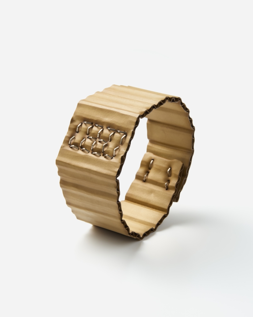 新作としてお目見えするのはスマートウォッチをモチーフにしたシルバーのバングル。ホワイトゴールドで作られたホッチキス芯のような線で「08:30」と示されています。